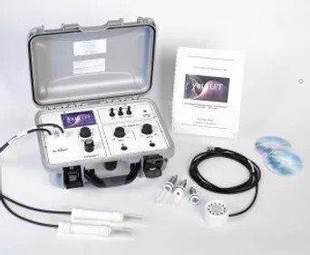 This device emits a low energy vibration that is safe and relaxing to experience. It is an electronic device that uses therapy heads containing noble gases in glass tubes. The gases are ionized by a high voltage field at low current (amperage). The therapy heads emit various fields of energy when touched onto the skin.